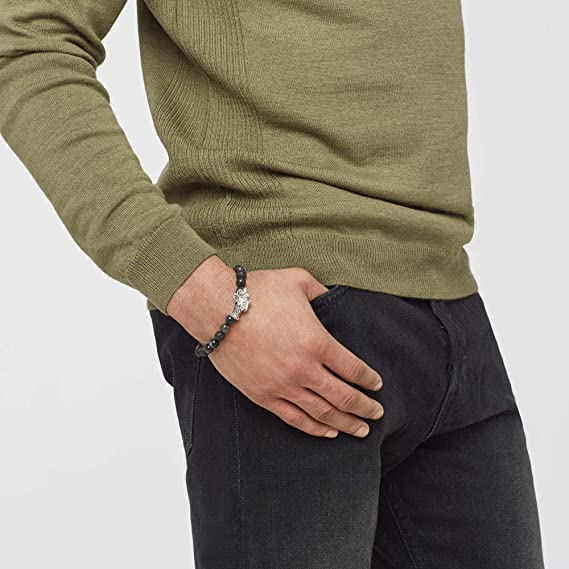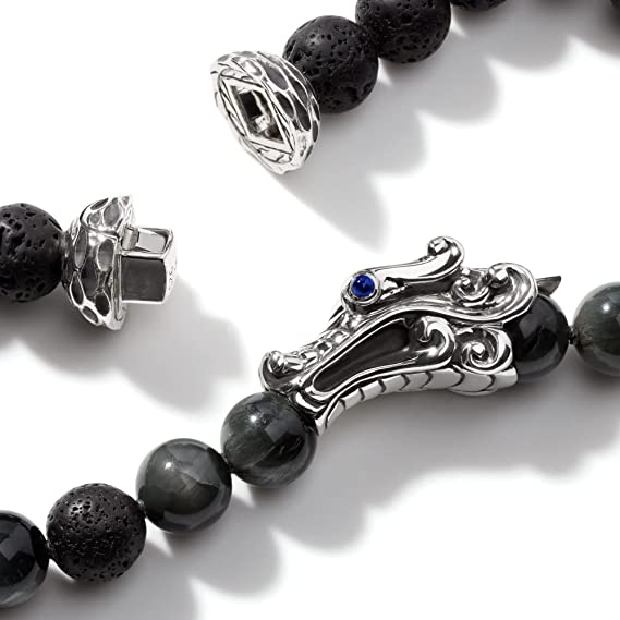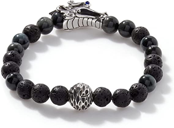 John Hardy Men's Legends Naga Silver Bracelet with Pusher Clasp with 8mm Eagle Eye & 8mm Black Volcanic Beads and Blue Sapphire Eyes